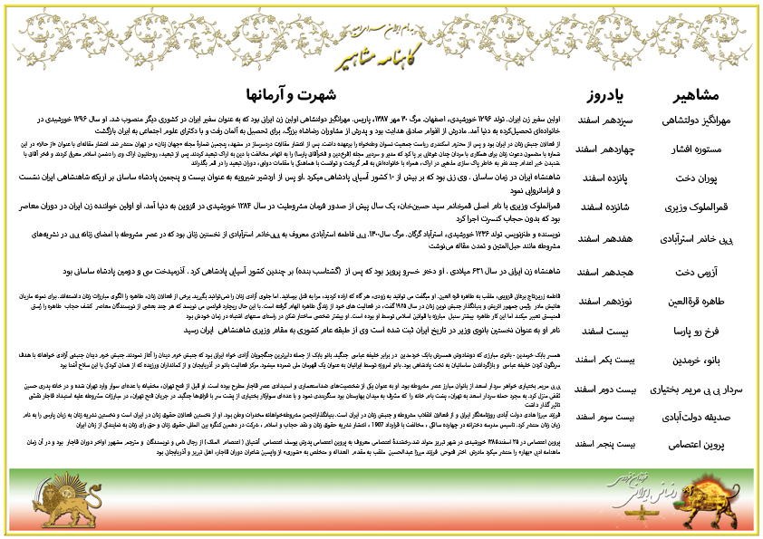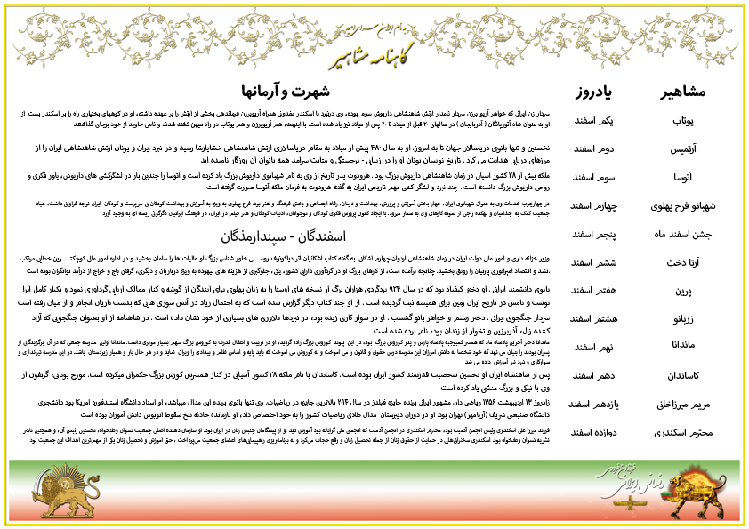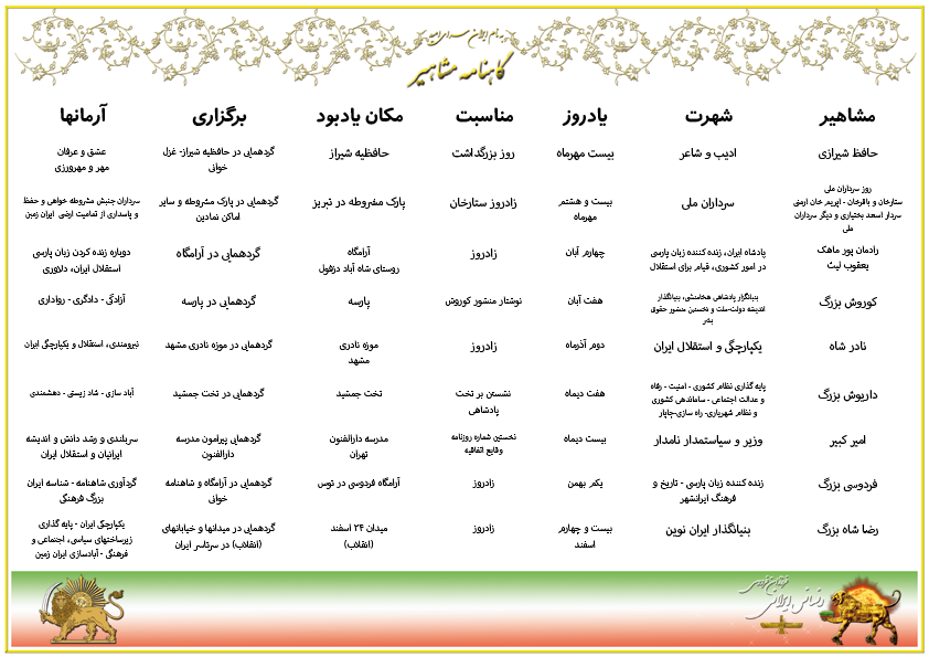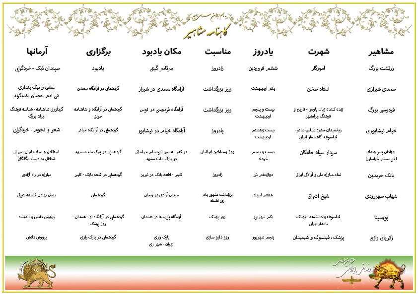 در ادامه این روند تولیدی راهکارهای مبارزاتی از سوی جنبش رنسانس ایرانی، فرزندان فردوسی، افتخار اینرا داریم که گاهنامه دیگری را منتشر می کنیم و نام آنرا گاهنامه مشاهیر و یا نامداران ایرانی میگذاریم.